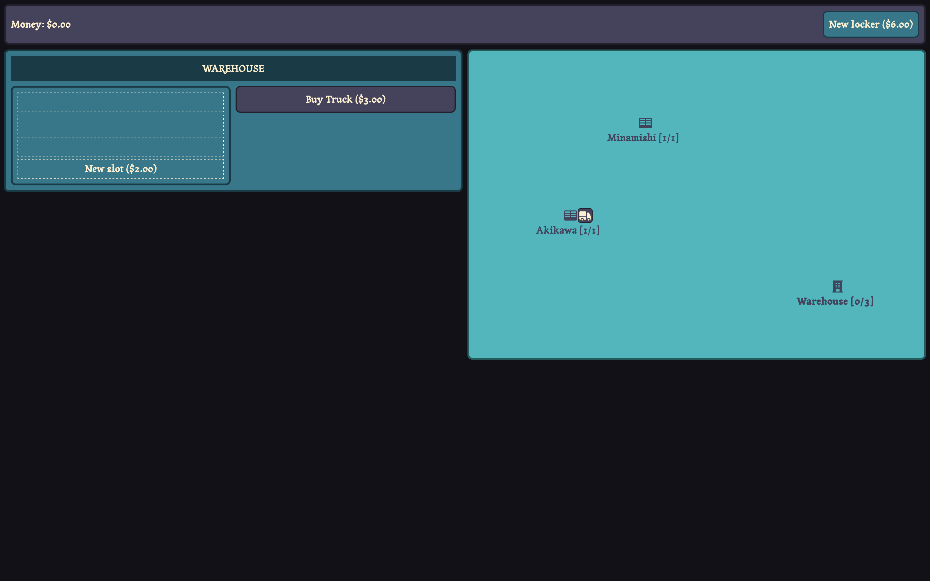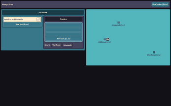 It's way too hard to control everything. In order to change the route of a truck, you have to click on the place they're going to, then stop them when they reach there, and then change everything. That should be possible to do just by selecting trucks. But also, you should just have a menu with a list of all the trucks and all the lockers and all the warehouses that you can just click on.